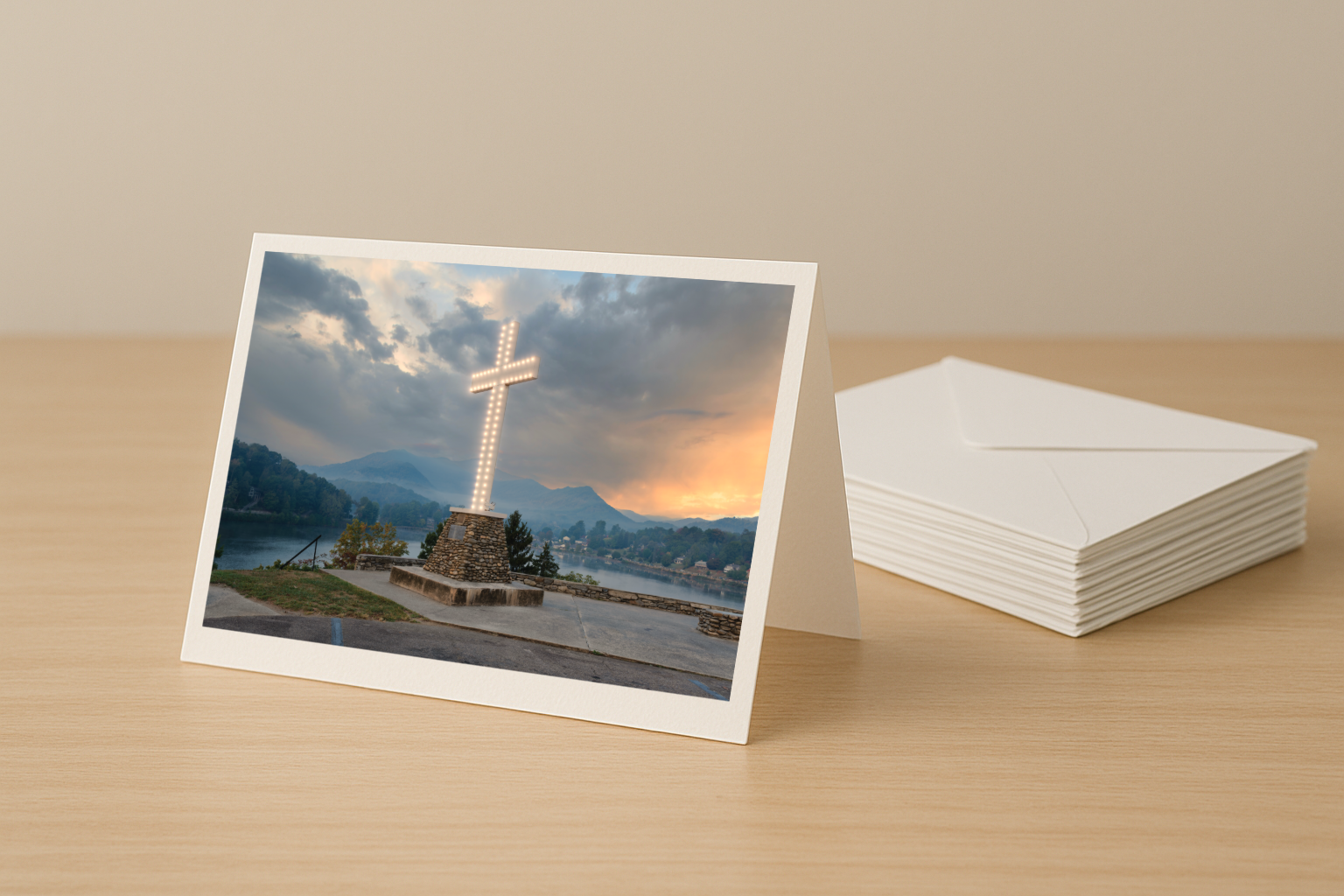 Box of 8 greeting cards with the image "The Cross at Lake Junaluska" printed on the front. Blank on the inside. The cards come in box with envelopes. Folded size is 6.25x4.5.